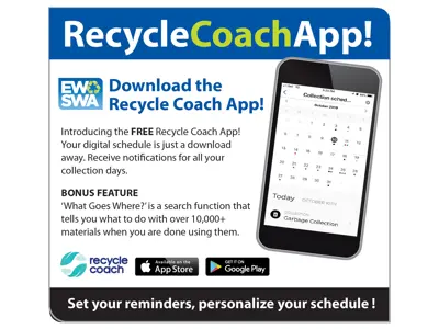 - Recycle Coach App: You can download the free Recycle Coach app at the Apple Store or Google Play. Set reminders for your collection days and receive notifications when a collection day changes due to a holiday.