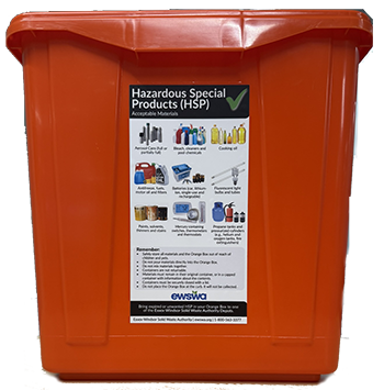 Back again by popular demand, the Orange Box Promotion is launching April 7th! Drop-off any 'hazardous and special products (HSP)' at an EWSWA Depot and receive a free Orange Box (16 gallon) for storage. Orange Boxes are for storage only, and will not be collected curbside. Orange Boxes are available while supplies last.